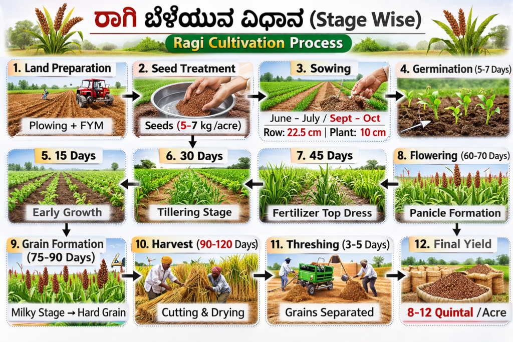 ರಾಗಿ ಕರ್ನಾಟಕದ ಪ್ರಮುಖ ಆಹಾರ ಬೆಳೆಗಳಲ್ಲಿ ಒಂದಾಗಿದೆ. ಕಡಿಮೆ ನೀರಿನಲ್ಲಿ ಉತ್ತಮ ಬೆಳೆಯುವ ರಾಗಿ, ಸಣ್ಣ ಮತ್ತು ಮಧ್ಯಮ ರೈತರಿಗೆ ಲಾಭದಾಯಕ ಬೆಳೆಯಾಗಿದೆ. ಈ ಲೇಖನದಲ್ಲಿ ರಾಗಿ ಬೆಳೆಯುವ ವಿಧಾನವನ್ನು ಹಂತ ಹಂತವಾಗಿ ತಿಳಿಯೋಣ.